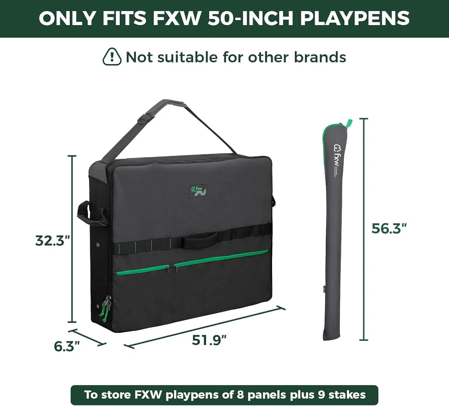 Only Suitable for FXW 50-inch Dog Playpens: The storage bag holds up to 8 panels of the 50-inch FXW playpen, 51.9” L×6.3” W×32.3” H. The stake bag is placed inside the largest zipper bag and can store up to 9 stakes, 56.3” H.Two front zipper pockets can be used to store additional dog items, such as bowls, leashes, toys, and so on.