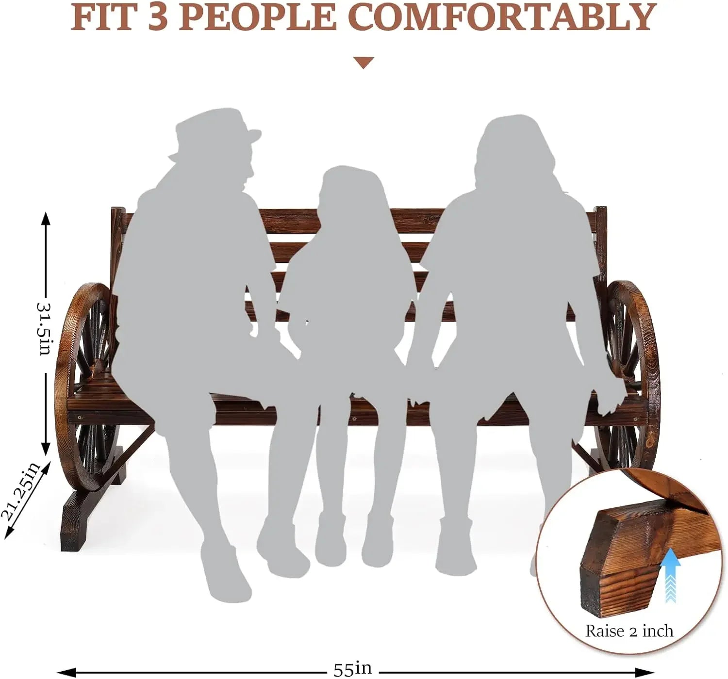 Dimensions and seating: Overall size 55 x 21.25 x 31.5 inches; seat is 52.5 inches long and sits 15.5 inches high, providing comfortable seating for up to three people. Color: Rustic; Finish: Burnt Wood.