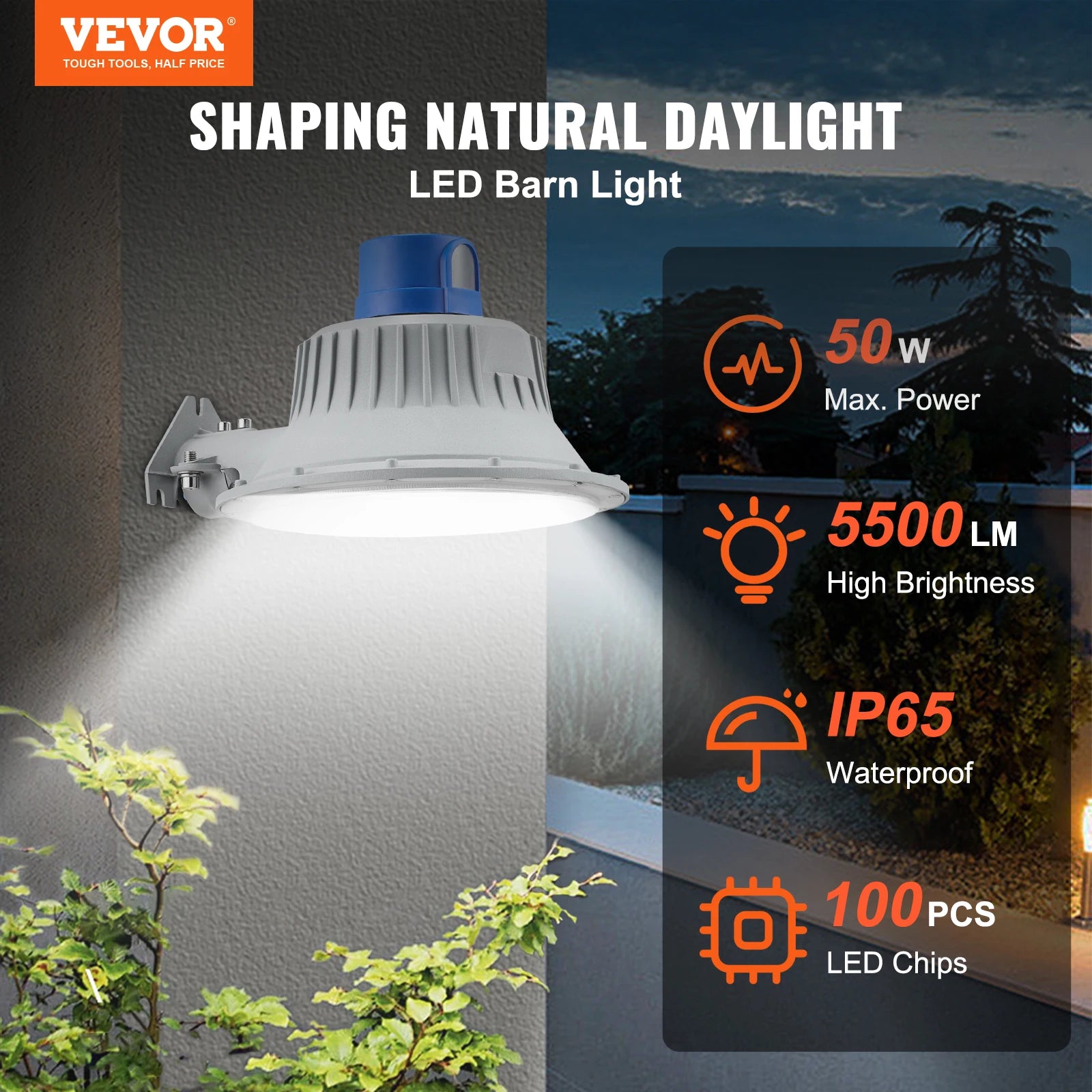 Brighten your outdoor spaces with the VEVOR LED Barn Light, a rugged, energy-efficient flood light designed to stand up to the elements. Featuring a 50W (also available in 100W) LED engine, this daylight flood light delivers up to 5500 lumens of crisp 6000K illumination, making barns, yards, driveways, and workshops safer and more productive after dark.